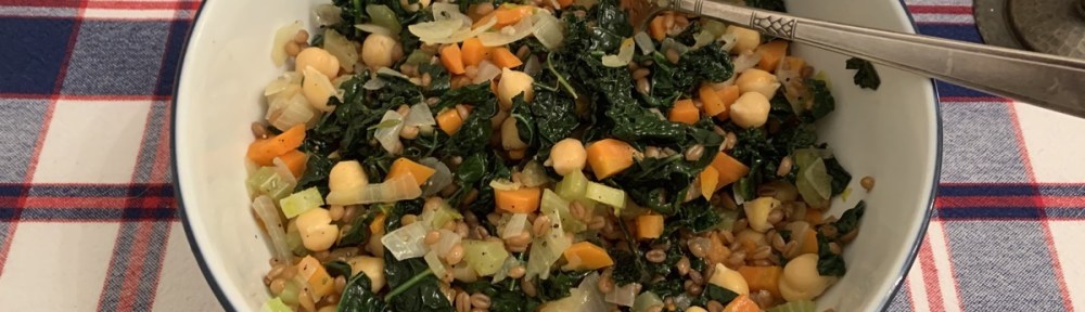 I used wheat berries (whole wheat kernels), but you can use any grain you prefer. Likewise, the greens could be chard, dandelion greens, turnip greens, etc. Most greens will cook more quickly than the lacinato kale. I tossed in some chickpeas for protein.